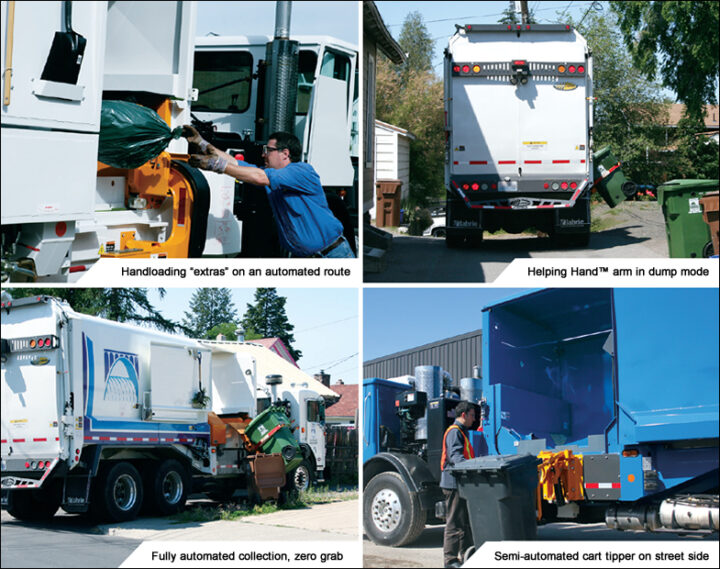 - Wide-angle tilting hydraulic cart tipper allows 38, 64 and 95 US gallon roll cart handling (140, 240 and 360 litres